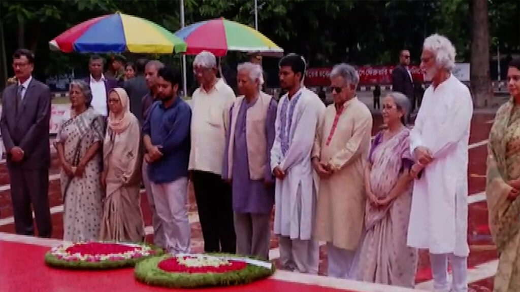প্রধান উপদেষ্টা হিসেবে শ্রদ্ধা নিবেদনের পর উপস্থিত ১৩ উপদেষ্টাকে সঙ্গে নিয়ে জাতীয় স্মৃতিসৌধে শ্রদ্ধা নিবেদন করেন ড. মুহাম্মদ ইউনূস। এসময় তিন বাহিনীর একটি চৌকস দল প্রধান উপদেষ্টাকে গার্ড অব অনার প্রদান করেন। বিউগলে বেজে ওঠে করুণ সুর।