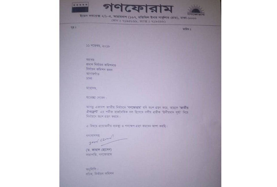 জাতীয় ঐক্যফ্রন্টের শরিক দল হিসেবে গণফোরাম নিজ প্রতিক ‘ঊদীয়মান সূর্য’ প্রতিকে নির্বাচন করবে বলে ইসিকে চিঠি দিয়েছে ড.কামাল হোসেন।