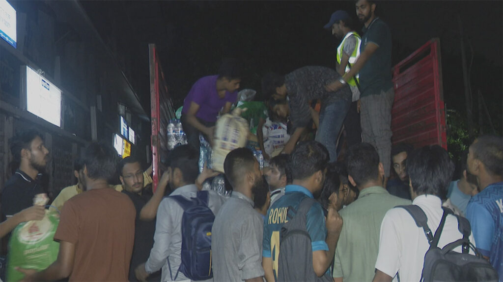 রাতভর এই প্যাকেজিংয়ে অংশ নিয়েছে ছাত্রীরাও। আন্দোলনের মতো এটিও তাদের কাছে একটি যুদ্ধ। তাদের একজন বলেন, যেগুলো খুব দরকারি জিনিস, সেগুলো বানভাসি মানুষের কাছে পৌঁছালে তাদের জন্য সহায়ক হবে। আমরা প্রতিটি গাড়িতে সাতশ থেকে আটশ বস্তা ত্রাণ নিতে পারছি।