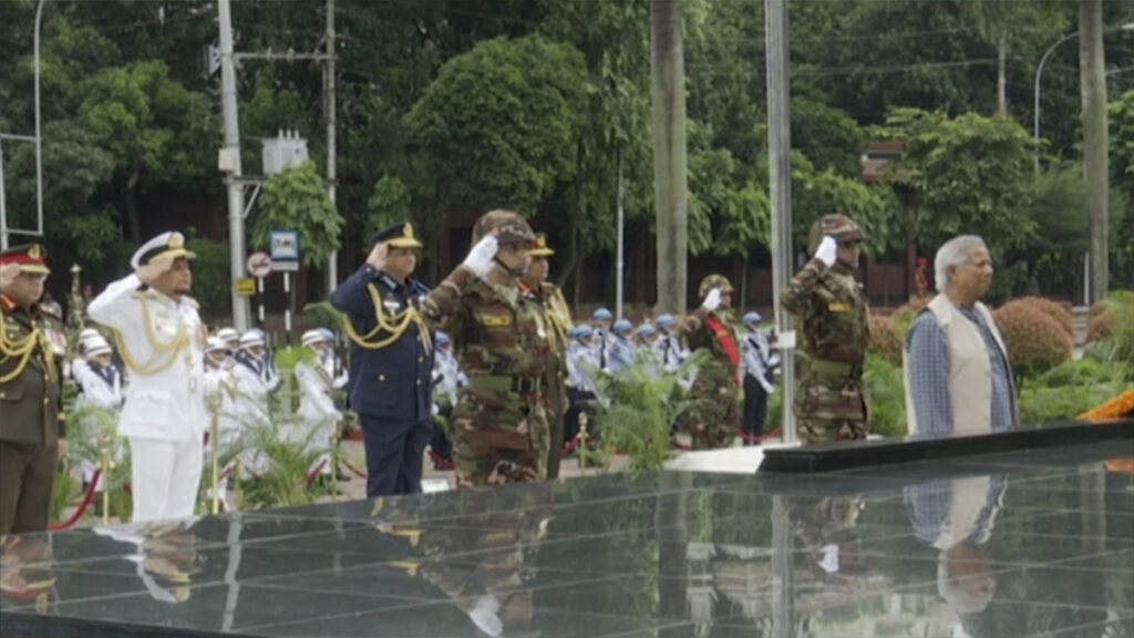 পুষ্পস্তবক অর্পণের পর প্রধান উপদেষ্টা সশস্ত্র বাহিনী বিভাগ পরিদর্শনে যান। সেখানে তিন বাহিনীর প্রধানরা তার সঙ্গে সৌজন্য সাক্ষাৎ করেন।