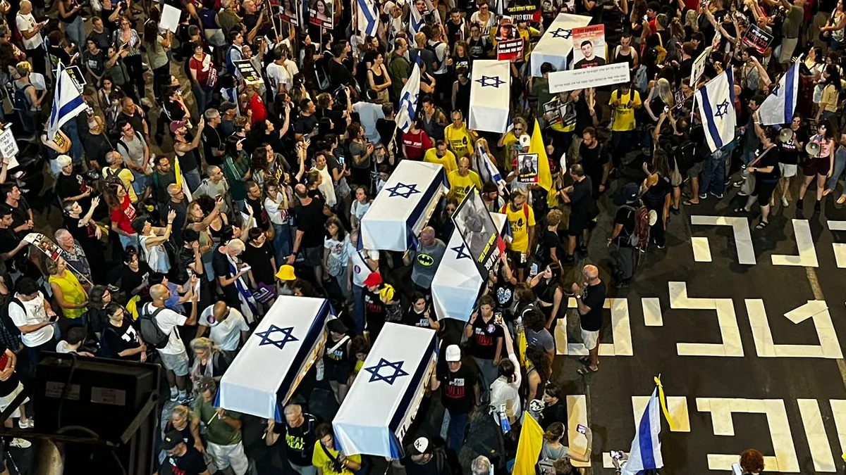 এবার কফিন নিয়ে নেতানিয়াহু বিরোধী বিক্ষোভ করলেন হামাসের হাতে জিম্মি ইসরায়েলিদের স্বজনেরা। ফিলিস্তিনি স্বাধীনতাকামী সংগঠনটির কাছে জিম্মি থাকা ইসরায়েলি মৃত্যুর ঘটনায় এই বিক্ষোভ হয়।