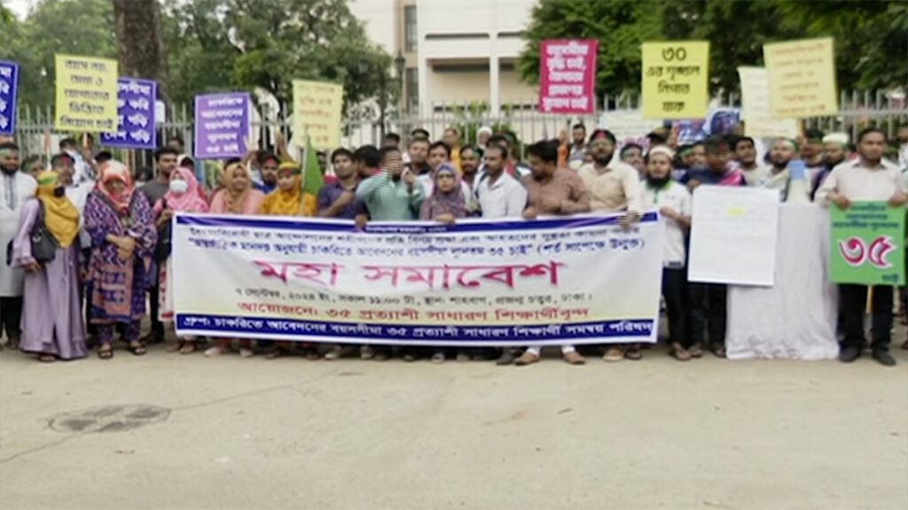 শনিবার (৭ সেপ্টেম্বর) সকালে রাজধানীর শাহবাগে সরকারি চাকরিতে আবেদনের বয়সসীমা ৩৫ করার দাবিতে মানববন্ধন করে ৩৫ সমন্বয় পরিষদ।