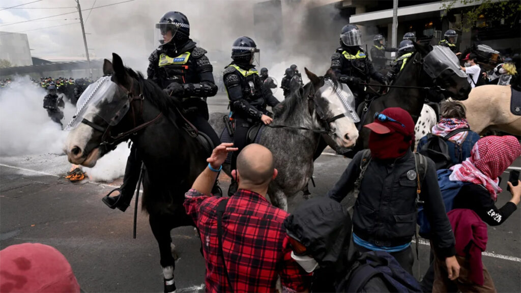 আজ বুধবার (১১ সেপ্টেম্বর) ব্যস্ততম শহর মেলবোর্নে রাস্তায় নামে বহু মানুষ। এসময় পুলিশের সঙ্গে ব্যাপক সংঘর্ষ হয় বিক্ষোভকারীদের। যুদ্ধবিরোধী নানা ধরনের স্লোগান সংবলিত প্ল্যাকার্ড নিয়ে বিক্ষোভ করেন তারা। ফিলিস্তিনপন্থী বিভিন্ন স্লোগানে প্রকম্পিত হয় রাজপথে।