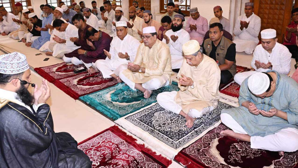 বঙ্গভবন জামে মসজিদের পেশ ইমাম মাওলানা সাইফুল কাবির মোনাজাত পরিচালনা করেন।
