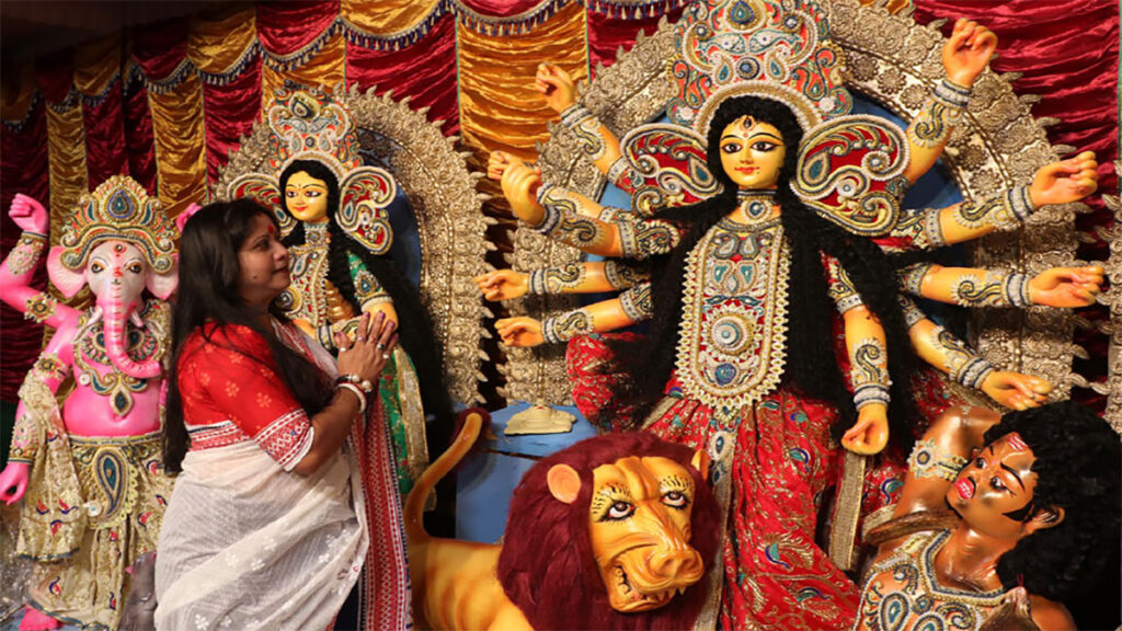 গতকাল ষষ্ঠীতে সকালে বিল্ববৃক্ষ (বেলগাছ তলে) দেবীর আবাহন, সংকল্প ও ‘ত্রিনয়নী’ দুর্গাদেবীর নিদ্রা (বোধন) ভাঙিয়ে পূজায় দেবীকে বরণ করা হয়। পূজার্চনা আর দেবীর আরাধনা করেন তার ভক্তরা।