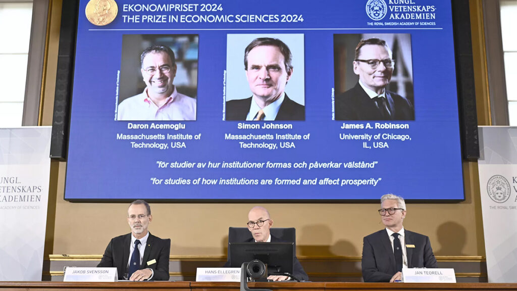 চলতি বছর অর্থনীতিতে নোবেল পেয়েছেন মার্কিন যুক্তরাষ্ট্রের ম্যাসাচুসেটস ইনস্টিটিউট অব টেকনোলজির অধ্যাপক ড্যারন আসেমোগলু, একই প্রতিষ্ঠানের সিমন জনসন এবং ইউনিভার্সিটি অব শিকাগো, ইলিনয়ের অধ্যাপক জেমস এ রবিনসন।