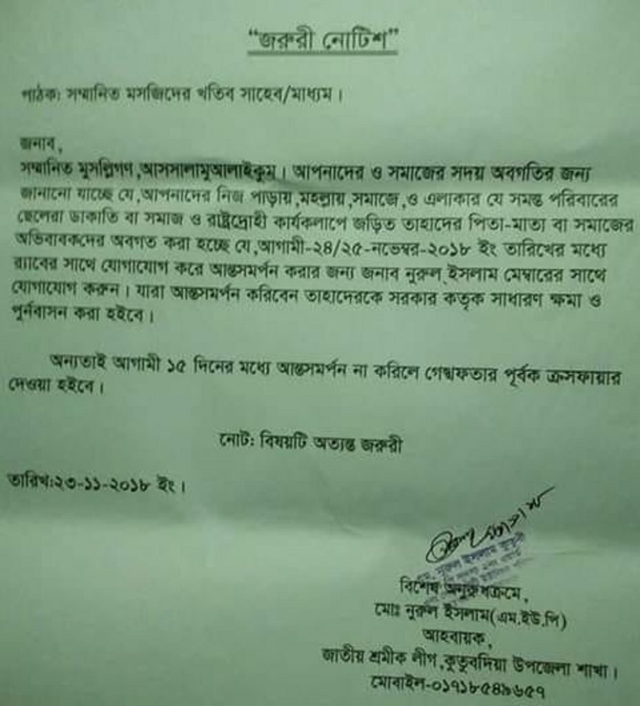 যে সমস্ত পরিবারের ছেলেরা ডাকাতি ও রাষ্ট্রদ্রোহী কার্যকলাপে জড়িত তারা যদি ২৪/২৫ নভেম্বর ২০১৮ এর মধ্যে র্যাবের সাথে যোগাযোগ করে আত্মসর্মণ না করে তাহলে আগামী ১৫ দিনের মধ্যে গ্রেফতার পূর্বক ক্রসফায়ার দেয়া হবে বলে এক ‘জরুরী নোটিশ’ দিয়েছেন কুতুবদিয়া উপজেলার জাতীয় শ্রমিক লীগের আহবায়ক মো: নুরুল ইসলাম।