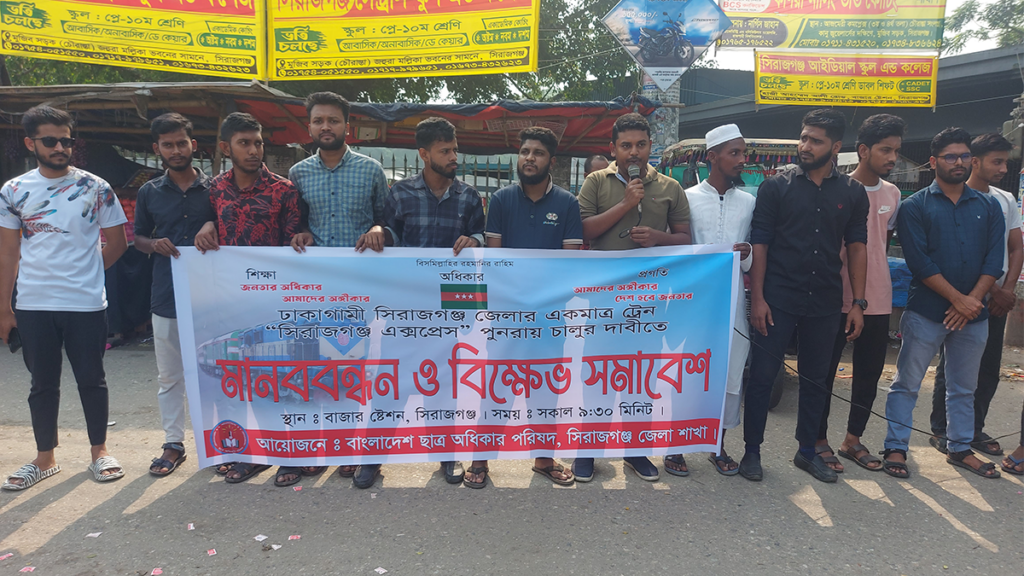 সিরাজগঞ্জ এক্সপ্রেস ট্রেন চালুর দাবিতে মানববন্ধন ও বিক্ষোভ করেছে শিক্ষার্থীরা। আজ শুক্রবার (১ নভেম্বর) সকালে সিরাজগঞ্জ বাজার স্টেশন চত্বরে বাংলাদেশ ছাত্র অধিকার পরিষদের ব্যানারে এ মানববন্ধন কর্মসূচি অনুষ্ঠিত হয়।
