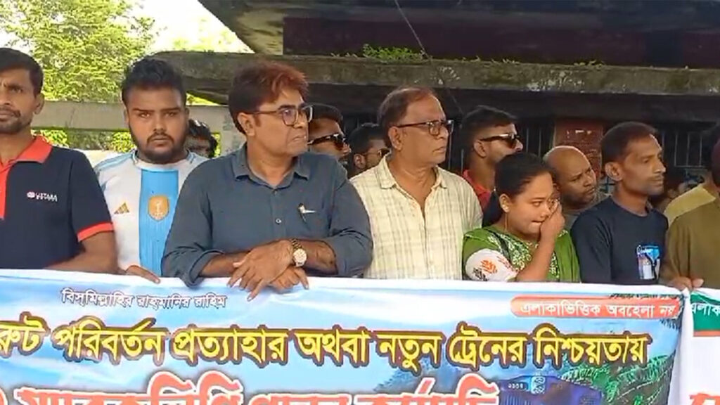 রাজবাড়ী হয়ে চলাচলকারী ঢাকাগামী বেনাপোল ও সুন্দরবন এক্সপ্রেস ট্রেনের রুট পরিবর্তনের সিদ্ধান্ত প্রত্যাহার অথবা নতুন ট্রেনের নিশ্চয়তার দাবিতে মানববন্ধন করেছে স্থানীয়রা। সোমবার (৪ নভেম্বর) সকাল ১০টার দিকে রাজবাড়ী জেলার সর্বস্তরের জনগণের ব্যানারে স্টেশন প্লাটফর্মে দুই ঘণ্টাব্যাপী এ মানববন্ধন অনুষ্ঠিত হয়।