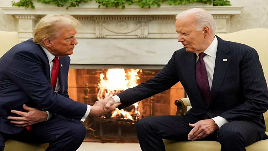ক্ষমতা হস্তান্তরের প্রক্রিয়া হিসেবে নবনির্বাচিত প্রেসিডেন্ট ডোনাল্ড ট্রাম্পকে হোয়াইট হাউজে স্বাগত জানিয়েছেন বর্তমান প্রেসিডেন্ট জো বাইডেন। বুধবার (১৩ নভেম্বর) স্থানীয় সময় সকালে ওভাল অফিসে এই দুই নেতার বৈঠক অনুষ্ঠিত হয়। এ সময় করমর্দন করে একে অপরকে অভিবাদন জানান।