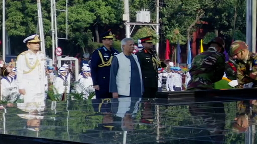 সকাল সোয়া ৮টার দিকে শিখা অনির্বাণে শ্রদ্ধা নিবেদন করেন প্রধান উপদেষ্টা। বীর শহীদদের প্রতি শ্রদ্ধা জানিয়ে, কিছুক্ষণ নীরবে দাঁড়িয়ে থাকেন তিনি। এসময় তাঁকে সেনা, নৌ ও বিমানবাহিনীর একটি চৌকস দল গার্ড অফ অনার প্রদান করেন। একইসাথে বিউগলে করুণ সুর বেজে ওঠে শিখা অনির্বাণ চত্বরজুড়ে। প্রধান উপদেষ্টার শ্রদ্ধা নিবেদনের পর রাষ্ট্রপতি, সেনা, নৌ ও বিমান বাহিনীর প্রধানগণ শ্রদ্ধা জানান। এসময়, শিখা অনির্বাণ চত্বরে রাখা দর্শনার্থী বইয়ে সই করেন অন্তর্বর্তী সরকারের প্রধান উপদেষ্টা, রাষ্ট্রপতি মো. সাহাবুদ্দিন।