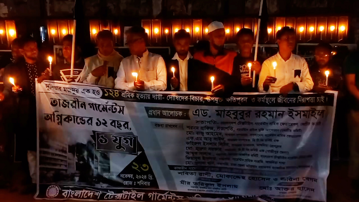 তাজরীন ট্রাজেডির একযুগ আগামীকাল রোববার। ২০১২ সালের ২৪ নভেম্বর আশুলিয়ার তাজরীন ফ্যাশনে অগ্নিকাণ্ডের ঘটনা ঘটে। আগুনে পুড়ে মারা যান ১১৭ জন। আহত হন দুই শতাধিক শ্রমিক। তাদের স্মরণে মোমবাতি জ্বালিয়ে শ্রদ্ধা জানানো হয়েছে।