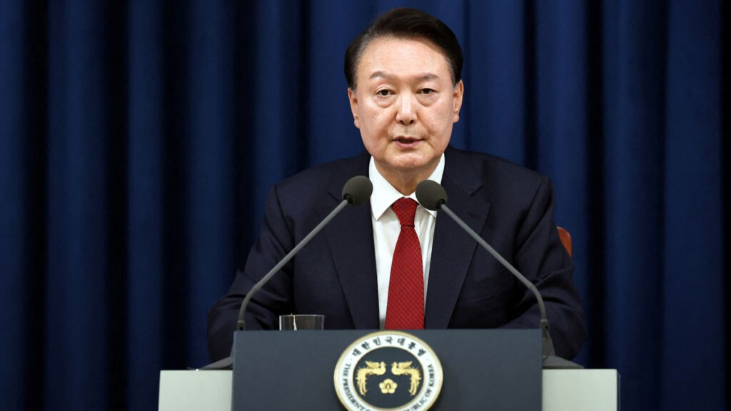 টেলিভিশনে সরাসরি সম্প্রচারিত এক ভাষণে তিনি এ ঘোষণা দেন। ভাষণে তিনি জানান, উত্তর কোরিয়ার হুমকি থেকে দেশকে রক্ষার জন্য কাজ করছেন এবং বিরোধীদের রাষ্ট্রবিরোধী শক্তি হিসেবে অভিযুক্ত করেছেন।