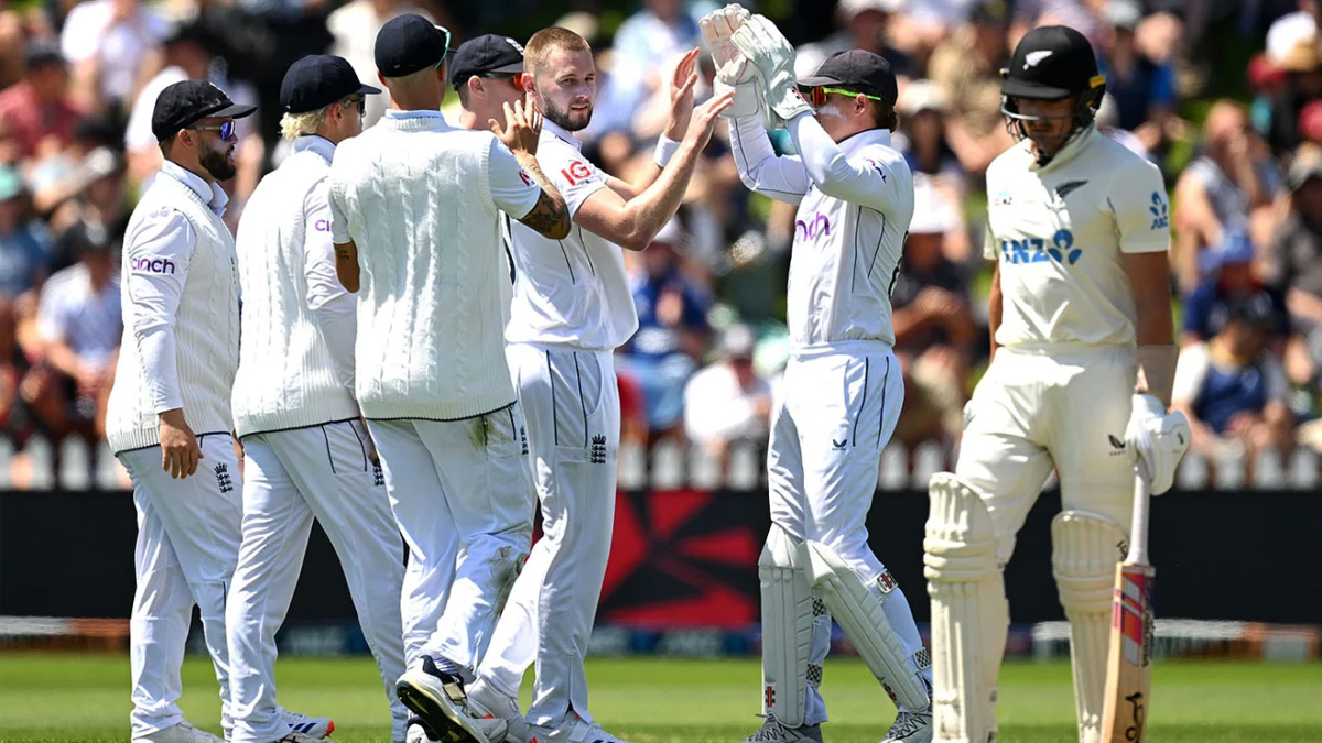 ওয়েলিংটন টেস্টের দ্বিতীয় দিনে ব্যাটে-বলে রীতিমতো দাপট দেখিয়েছে সফরকারী ইংল্যান্ড। বেন ডাকেট, জ্যাকব বেথেল, জো রুট ও হ্যারি ব্রুকের ফিফটিতে দিনশেষে তাদের লিড বেড়ে দাঁড়িয়েছে ৫৩৩ রানে। এতেই চালকের আসনে ইংলিশরা। এর আগে দিনের শুরুতে হ্যাটট্রিক করে চমক দেখান ইংলিশ পেসার গাস অ্যাটকিনসন। বেসিন রিজার্ভ স্টেডিয়ামে এটিই প্রথম টেস্ট হ্যাটট্রিক।