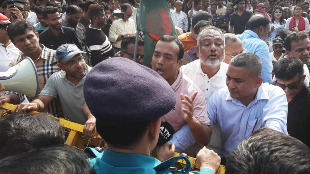 রাজধানীর রামপুরায় ছাত্র-যুব-স্বেচ্ছাসেবক দলের ভারতীয় হাইকমিশন অভিমুখী প্রতিবাদী পদযাত্রা আটকে দিয়েছে পুলিশ। রোববার (৮ ডিসেম্বর) সকাল সাড়ে ১১টায় নয়াপল্টনে বিএনপির দলীয় কার্যালয়ের সামনে থেকে শুরু হয় এ পদযাত্রা।