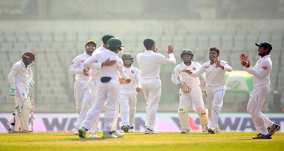 মিরপুরের হোম অব ক্রিকেটে আগের দিন ৫ উইকেটে ৭৫ রানের সংগ্রহ সমৃদ্ধ করতে তৃতীয় দিনের শুরু করে উইন্ডিজ। দিনের শুরুতেই শিমরন হিটমায়ারকে নিজের চতুর্থ শিকার বানান মেহেদি হাসান মিরাজ। ইনিংস সেরা ৩৯ রান করেন হিটমায়ার। অতিথিদের স্কোর তখন ৮৬। ছোট্ট বিরতিতে দেবেন্দ্র বিশু-কেমাররোচ আর ৩৭ করা শেন ডরউইচকে তুলে নেন মিরাজ। ক্যারিয়ারে ষষ্ঠবারের মতো ৫ উইকেট পেলেন এই অফস্পিনার। ১১১ রানে উইন্ডিজের প্রথম ইনিংস। টেস্টে যা বাংলাদেশের বিপক্ষে ক্যারিবিয়দের সর্বনিম্ন দলীয় স্কোর। মিরাজ ৭ আর সাকিব নেন ৩ উইকেট। ৩৯৭ রানে পিছিয়ে থেকে দ্বিতীয় দফা ব্যাটিংয়ে নেমে টাইগার স্পিনারদের ভেল্কিতে ২৯ রানেই ক্রেইগ ব্রাথওয়েট, কাইরন পাওয়েল, আমব্রিস আর রস্টন চেইসকে হারায় অতিথিরা। এ্রর আগে মাহমুদুল্লাহ রিয়াদের ক্যারিয়ার সেরা ১৩৬ রানের ইনিংসে প্রথমে ব্যাটিংয়ে নেমে ৫০৮ রান তুলে টাইগাররা।