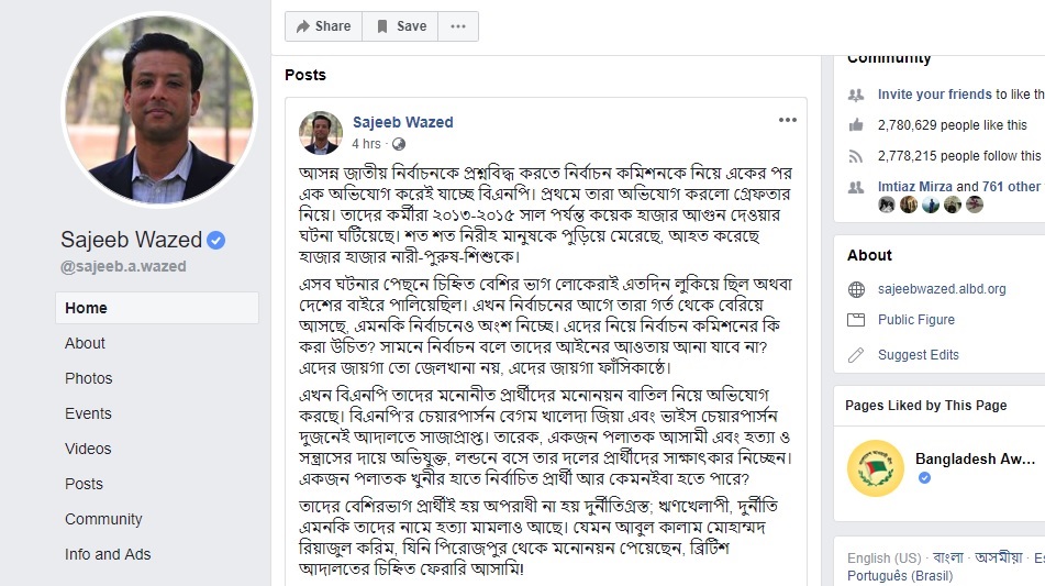 প্রধানমন্ত্রীর তথ্যপ্রযুক্তি উপদেষ্টা সজীব ওয়াজেদ জয় বলেছেন, আসন্ন জাতীয় নির্বাচনকে প্রশ্নবিদ্ধ করতে নির্বাচন কমিশনকে নিয়ে একের পর এক অভিযোগ করেই যাচ্ছে বিএনপি।