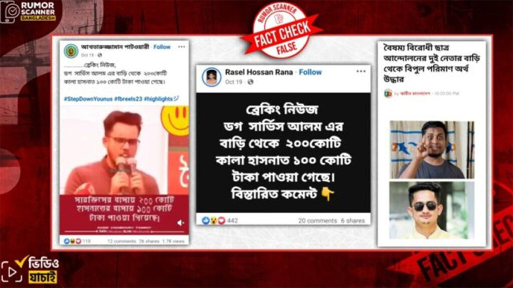 রিউমার স্ক্যানারের প্রতিবেদনে বলা হয়, বৈষম্যবিরোধী ছাত্র আন্দোলনের নেতা সারজিস আলম ও হাসনাত আবদুল্লাহর বাড়িতে ২০০ ও ১০০ কোটি টাকা পাওয়ার তথ্যটি সঠিক নয়। বৈষম্যবিরোধী ছাত্র আন্দোলনের কেন্দ্রীয় নির্বাহী কমিটির সদস্য মো. তারিকুল ইসলামের বক্তব্যের একটি খণ্ডিত অংশ প্রচার করে আলোচিত ভুয়া দাবিটি উত্থাপন করা হয়েছে।