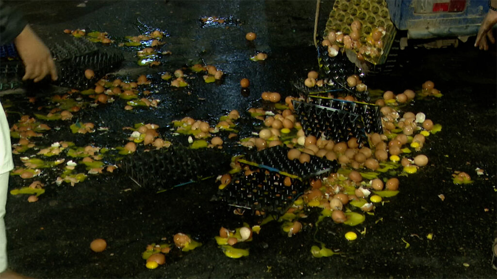 মহাখালীতে কাভার্ড ভ্যানের ধাক্কায় মাঝ সড়কে উল্টে গেছে ডিম বোঝাই পিকআপ। এতে নষ্ট হয়েছে প্রায় ২৫ হাজার ডিম।