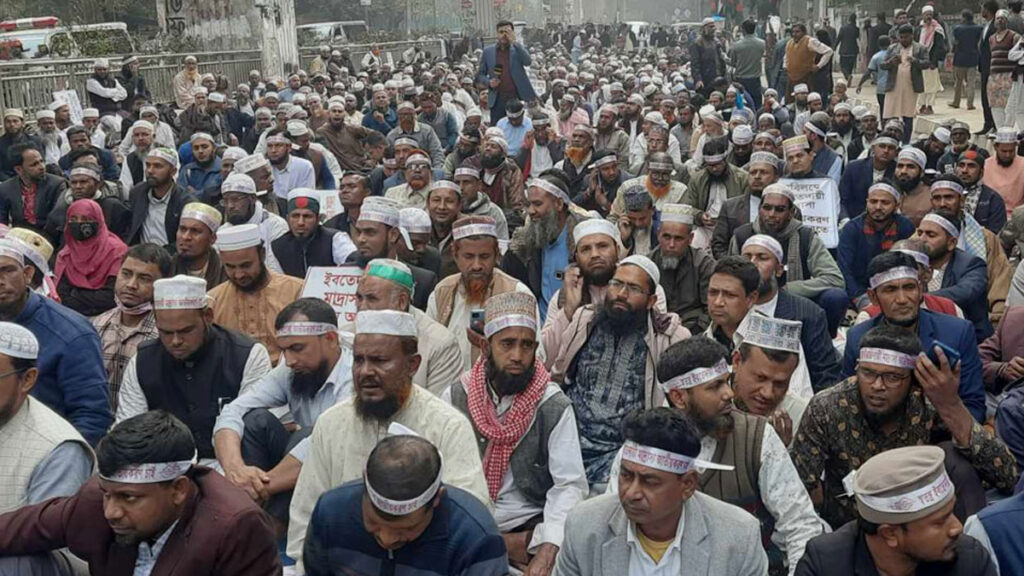 স্বতন্ত্র ইবতেদায়ী মাদরাসাকে জাতীয়করণের দাবিতে টানা নবম দিনের মতো অবস্থান কর্মসূচি পালন করছে ইবতেদায়ী মাদরাসা শিক্ষকরা।