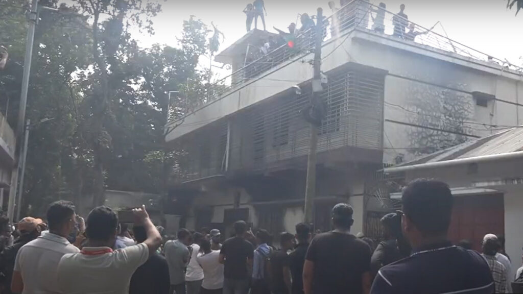 এ সময় বিক্ষুব্ধ জনতা বাড়ির ভেতরে থাকা কিছু আসবাবপত্র জড়ো করে আগুন ধরিয়ে দেয়। পাশাপাশি ভবনটির ওপরের অংশে আগুন ধরিয়ে দেয়া হয়। বুধবার দুপুর ২টা ৩০ মিনিটে এই প্রতিবেদন লেখা পর্যন্ত ভাঙচুর চলছে।