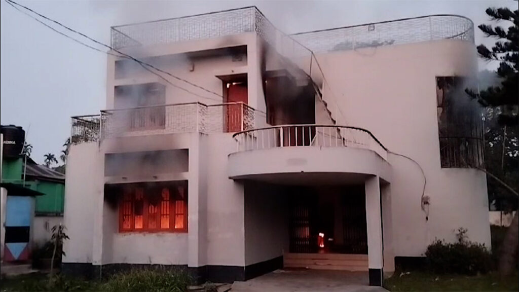 এ সময় বাড়িটিতে ভাঙচুর চালায় বিক্ষুব্ধরা। একপর্যায়ে বাড়িটির ভেতর আগুন ধরিয়ে দেয়া হয়। তাছাড়া বাড়িটির সামনে গান বাজিয়ে উল্লাশ করতেও দেখা যায়।