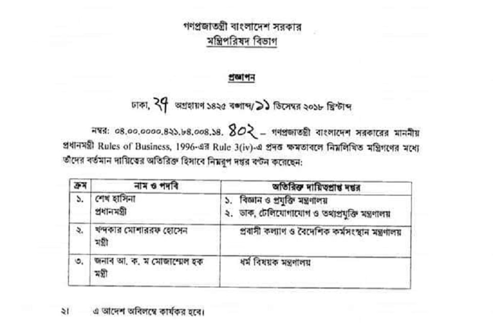 খন্দকার মোশাররফ হোসেন প্রবাসীকল্যাণ ও বৈদেশিক কর্মসংস্থান মন্ত্রণালয় ও আ ক ম মোজাম্মেল হক ধর্ম মন্ত্রণালয়ের দায়িত্ব পালন করবেন।