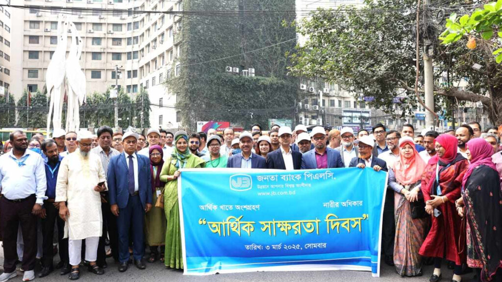 আর্থিক স্বাক্ষরতা দিবস উপলক্ষে জনতা ব্যাংক পিএলসির উদ্যোগে এক বর্ণাঢ্য র্যালি অনুষ্ঠিত হয়। আজ সোমবার (৩ মার্চ) র্যালিটি জনতা ব্যাংক প্রধান কার্যালয়ের সামনের সড়ক থেকে শুরু হয়ে মতিঝিল-দিলকুশা ফোয়ারা চত্ত্বর প্রদক্ষিণ করে।