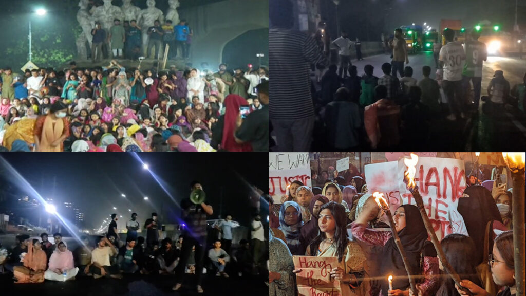 আমার সোনার বাংলায় ধর্ষকদের ঠাই নাই স্লোগানে মধ্যরাতে হঠাৎই উত্তপ্ত হয়ে ওঠে ঢাবি ক্যাম্পাস। তুমি কে, আমি কে? আছিয়া…আছিয়া স্লোগানে স্লোগানে মুখরিত হয়ে ওঠে পুরো ক্যাম্পাস।