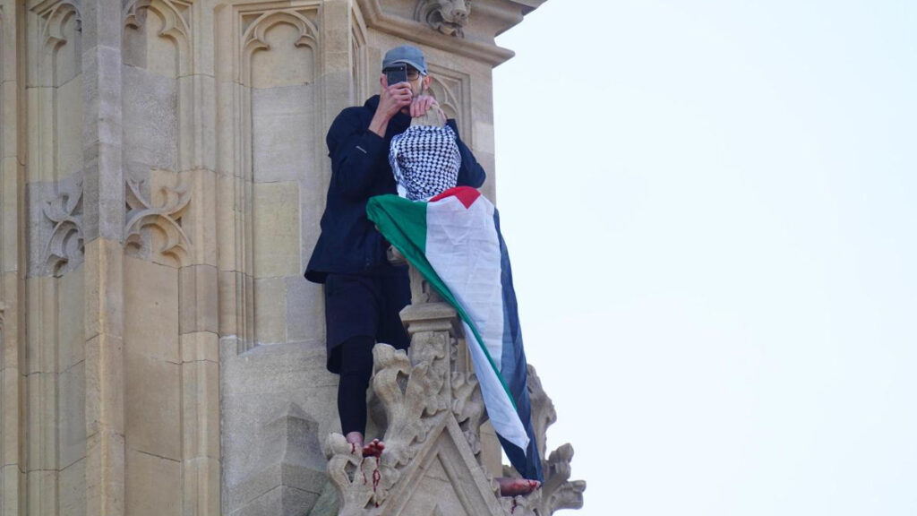 লন্ডনের আইকনিক বিগ বেন টাওয়ারে ফিলিস্তিনের পতাকা ওড়ালেন এক ব্যক্তি। বিখ্যাত এলিজাবেথ টাওয়ার বেয়ে উঠে প্রতিবাদ জানালেন টানা ১৬ ঘণ্টা।