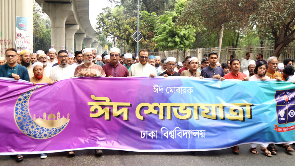 সোমবার (৩১ মার্চ) ঢাকা বিশ্ববিদ্যালয়ের কেন্দ্রীয় মসজিদের প্রথম জামাতের নামাজ শেষে শোভাযাত্রা বের হয়।
