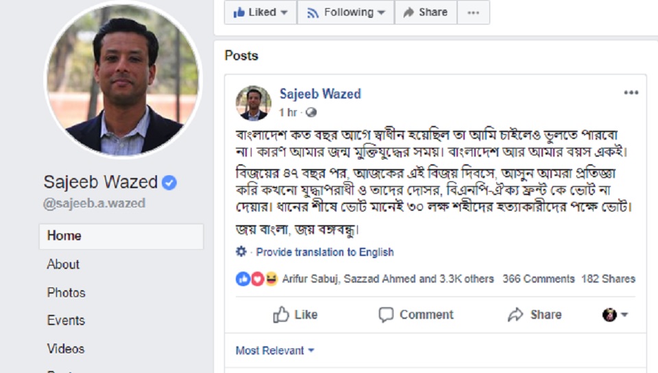 সজীব ওয়াজেদ জয়ের ফেসবুক পোস্টটি তুলে ধরা হলো-
