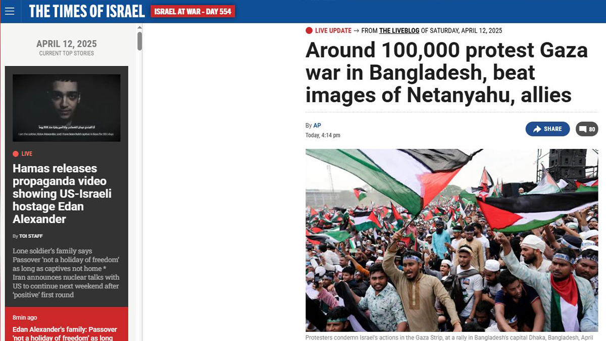 ‘বাংলাদেশে গাজা যুদ্ধের প্রতিবাদে প্রায় ১ লাখ লোকের বিক্ষোভ, নেতানিয়াহু ও তার সমর্থনকারীদের ছবি পদদলিত’ শিরোনামে প্রতিবেদনটিতে উল্লেখ করা হয়, প্রায় ১ লাখ বিক্ষোভকারী ঢাকা বিশ্ববিদ্যালয় এলাকার সোহরাওয়ার্দী উদ্যানে জড়ো হয়েছেন। এসময় ফিলিস্তিনি পতাকা নিয়ে ‘ফ্রি ফ্রি প্যালেস্টাইন’ স্লোগান দেয়া হয়।