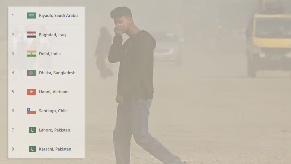 এদিকে, বিশ্বের দূষিত শহরের তালিকায় আজ ২৫৩ স্কোর নিয়ে শীর্ষে অবস্থান করছে সৌদি আরবের শহর রিয়াদ। শীর্ষ তিনের অপর শহর বাগদাদের ইরাক ও ভারতের দিল্লি। এদের স্কোর যথাক্রমে ১৭২ ও ১৬৯।