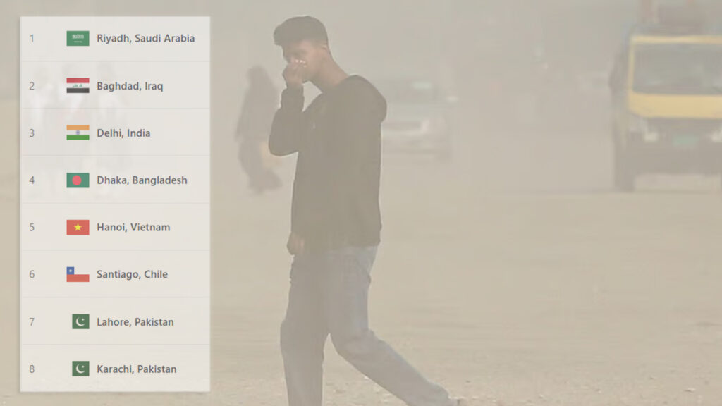 এদিকে, বিশ্বের দূষিত শহরের তালিকায় আজ ২৫৩ স্কোর নিয়ে শীর্ষে অবস্থান করছে সৌদি আরবের শহর রিয়াদ। শীর্ষ তিনের অপর শহর বাগদাদের ইরাক ও ভারতের দিল্লি। এদের স্কোর যথাক্রমে ১৭২ ও ১৬৯।