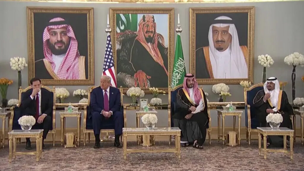 সৌদি আরবের রাজধানী রিয়াদের কিং খালিদ আন্তর্জাতিক বিমানবন্দরে সাবেক মার্কিন প্রেসিডেন্ট ডোনাল্ড ট্রাম্প ও সৌদি ক্রাউন প্রিন্স মোহাম্মদ বিন সালমানের (এমবিএস) প্রথম বৈঠক শুরু হয়েছে। সৌদি রাজপরিবারের সদস্যদের প্রতিকৃতির পাশে এই বৈঠক অনুষ্ঠিত হচ্ছে। বৈঠকে ট্রাম্পের সাথে রয়েছেন পররাষ্ট্রমন্ত্রী মার্কো রুবিও।