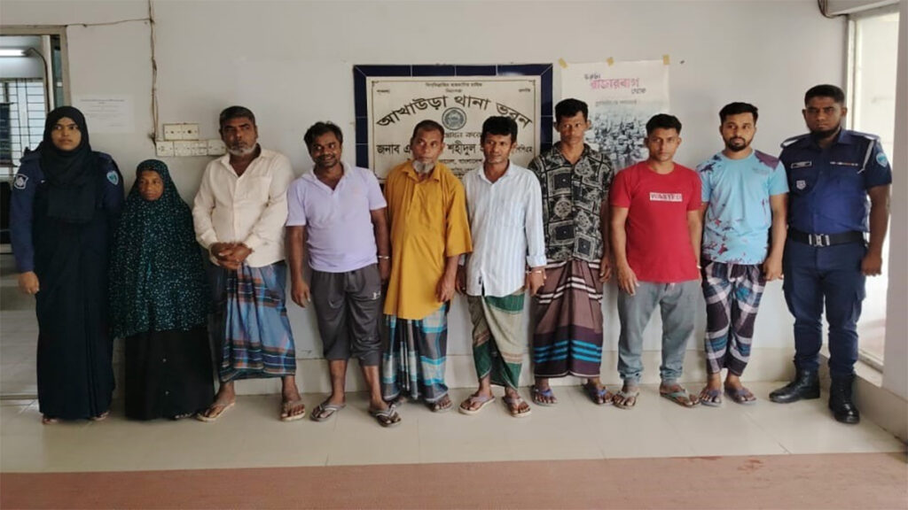 গ্রেফতার হলেন– মাইন উদ্দিন, সম্রাট মিয়া, রুহুল আমিন, আনু বেগম, জয়নাল ভুইয়া, কালাম মিয়া, ফোরকান মিয়া ও মোতালেব মিয়া।