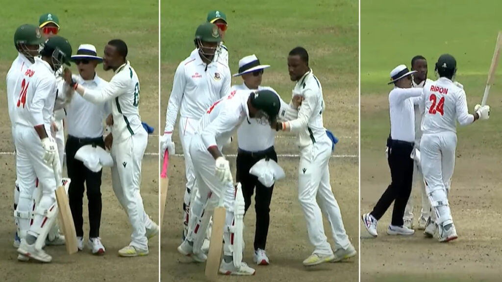 ঘটনাটি ১০৫তম ওভারের। প্রথম বলে ডাউন দ্য উইকেটে গিয়ে ছক্কা মারেন রিপন। এতেই যেন মেজাজ হারিয়ে ফেলেন দক্ষিণ আফ্রিকার এনটুলি। দুই ব্যাটার যখন ক্রিজের মাঝে, তখন কিছু একটা বলতে বলতে এগিয়ে আসেন রিপনের দিকে। কাছাকাছি এসে উত্তপ্ত বাক্যবিনিময়ের মধ্যেই আগ বাড়িয়ে ধাক্কা দিতে চান এনটুলি, যা কয়েক দফায় হাত দিয়ে আটকানোর চেষ্টা করেন রিপন।