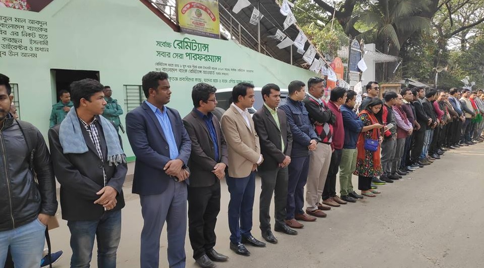 দোহার নবাবগঞ্জে সাংবাদকর্মীদের ওপর হামলার ঘটনায় মানববন্ধন করেছেন সাংবাদিকরা। জাতীয় প্রেসক্লাবের সামনে সকাল ১১টায় মানববন্ধন শুরু হয়। এসময় বিভিন্ন টেলিভিশন, পত্রিকা রেডিওসহ বিভিন্ন গণমাধ্যমের কর্মীরা যোগ দেন।