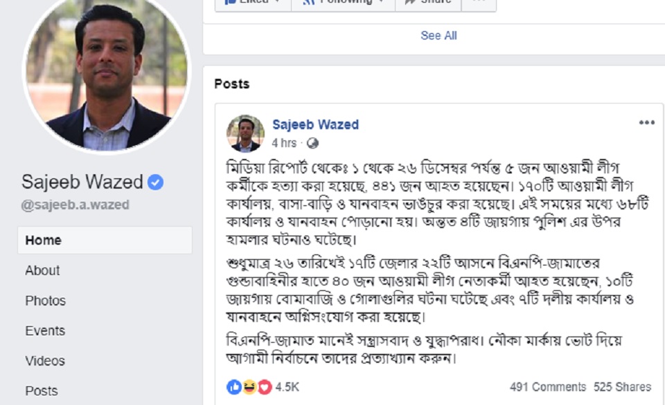 স্ট্যাটাসে তিনি আরো লেখেন, মিডিয়া রিপোর্ট থেকে: ১ থেকে ২৬ ডিসেম্বর পর্যন্ত ৫ জন আওয়ামী লীগ কর্মীকে হত্যা করা হয়েছে, ৪৪১ জন আহত হয়েছেন। ১৭০টি আওয়ামী লীগ কার্যালয়, বাসা-বাড়ি ও যানবাহন ভাঙচুর করা হয়েছে। এই সময়ের মধ্যে ৬৮টি কার্যালয় ও যানবাহন পোড়ানো হয়। অন্তত ৪টি জায়গায় পুলিশ এর উপর হামলার ঘটনাও ঘটেছে।
