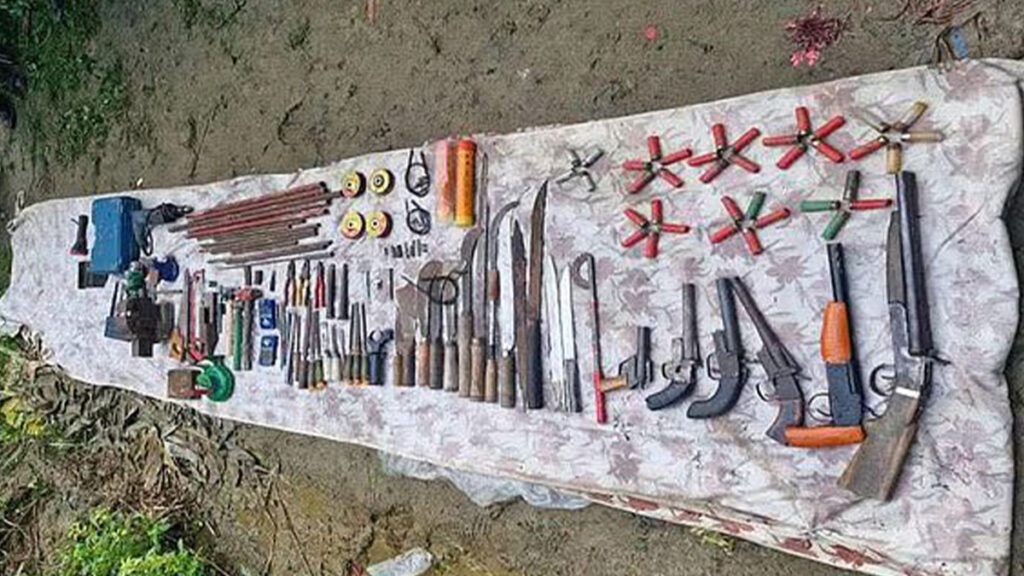 আজ শনিবার (৩০ আগস্ট) সকালে এই অভিযান পরিচালনা করা হয়। এ সময় ৬টি দেশীয় অস্ত্র, ৩৫ রাউন্ড খালি কার্তুজ, ৫ রাউন্ড তাজা কার্তুজ, একটি চাইনিজ কুড়াল, ২০টি ছুরি, চার্জারসহ ২টি ওয়াকিটকি, ১টি মেগাফোন, ৪টি প্যারাসুট ফ্লেয়ার এবং অস্ত্র তৈরির বিভিন্ন সরঞ্জাম ও যন্ত্রপাতি উদ্ধার করা হয়।