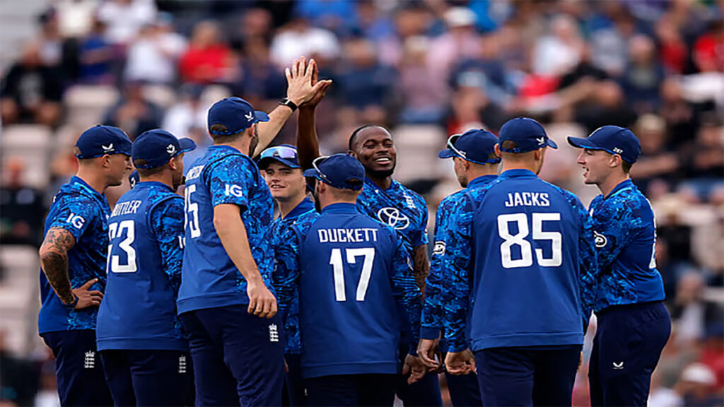 সাউদাম্পটনে টস হেরে ব্যাট করতে নেমে ৩১ রানে ফেরেন বেন ডাকেট। ৬২ রান করে ক্যাচ আউটের ফাঁদে পড়েন জেমি স্মিথ। ১১০ রান করে দলীয় সংগ্রহ বড় করে সাজঘরে ফেরেন জ্যাকব বেথেল। সেঞ্চুরি হাঁকান জো রুটও। নির্ধারিত ওভার শেষে ৫ উইকেট হারিয়ে ৪১৪ রানে ইনিংস শেষ করে ইংল্যান্ড।