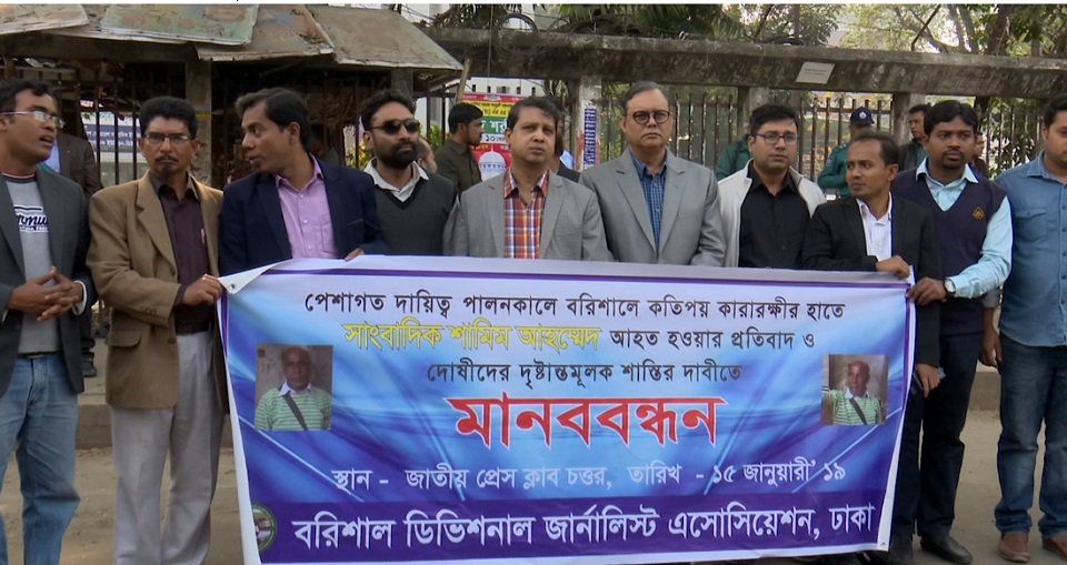 সেখানে সাংবাদিকরা হামলায় জড়িতদের দ্রুত গ্রেফতারের দাবি জানান। পেশাগত দায়িত্ব পালন করতে গিয়ে বরিশালে কয়েকজন কারারক্ষীর হামলার শিকার হন দৈনিক যুগান্তরের বরিশাল প্রতিনিধি শামীম আহমেদ। এ ধরনের ঘটনা বন্ধে সরকারকে ব্যবস্থা নেয়ার আহ্বান জানান সাংবাদিক নেতারা ।
