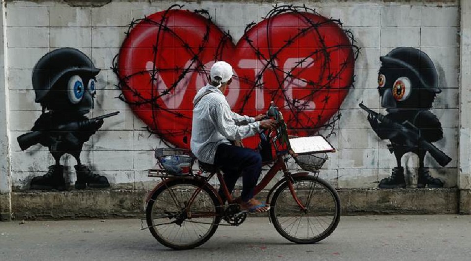 FILE PHOTO: A man bikes past a graffiti with the word 'vote', as the first national election since the military seized power in 2014 coup is set for next month, in Bangkok, Thailand January 11, 2019. REUTERS/Jorge Silva/File Photo