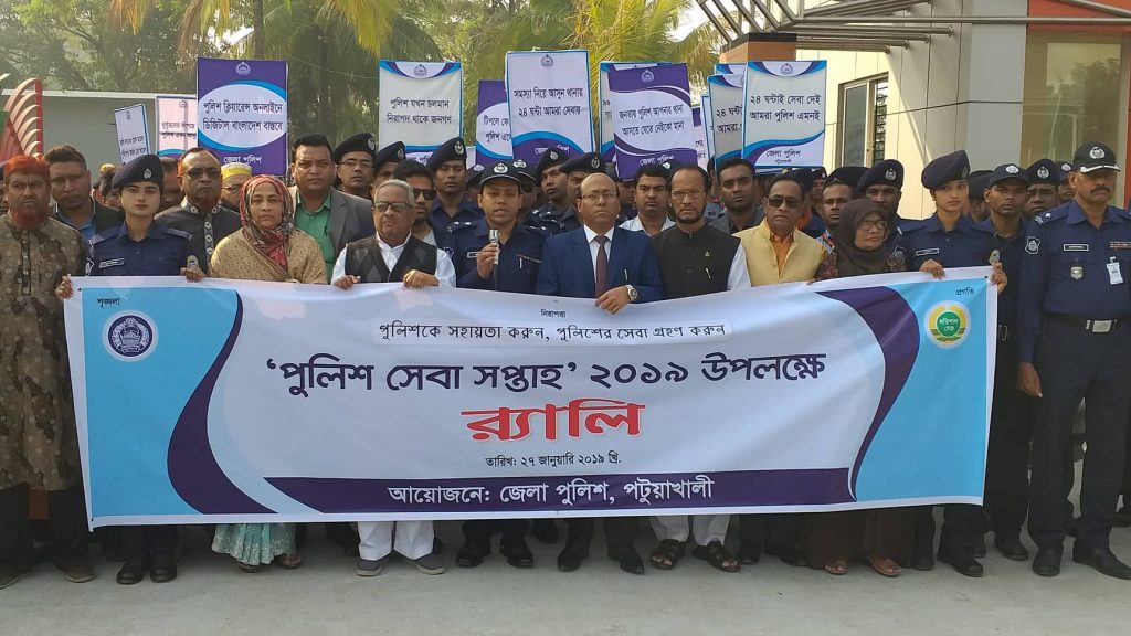 নানা আয়োজনের মধ্য দিয়ে পটুয়াখালীতে পুলিশ সেবা সপ্তাহ পালিত হয়েছে। পুলিশকে সহায়তা করুন,পুলিশের সেবা গ্রহণ করুণ শ্লোগানে রবিবার সকাল ১০ টায় শহরের পুলিশ লাইন থেকে এক বণাঢ্য র্যালি শুরু হয়ে শহরের বিভিন্ন সড়ক প্রদক্ষিণ করে সদর থানায় গিয়ে শেষ হয়। র্যালির উদ্বোধন করেন স্থানীয় সাংসদ সদস্য আলহাজ্ব শাহ্জাহান মিয়া।