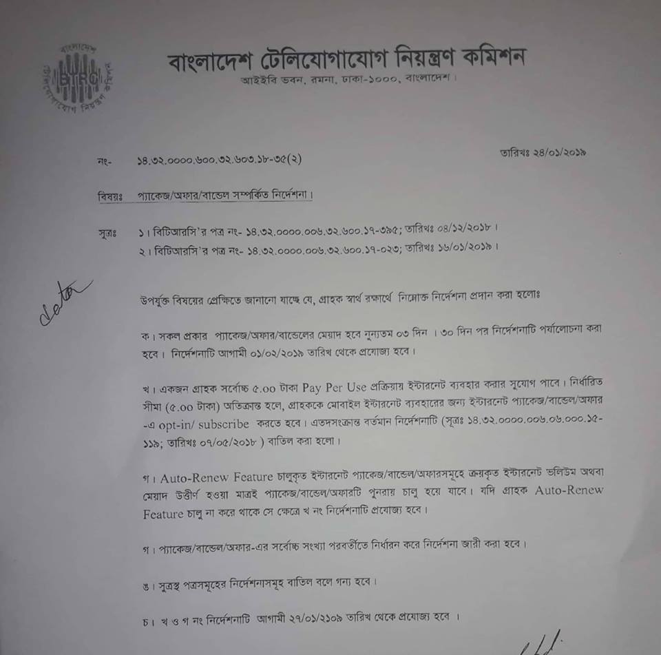 সম্প্রতি জারি করা নির্দেশানায় বলা হয়, সকল প্রকার প্যকেজ-অফার-বান্ডলের মেয়াদ হবে ন্যূনতম তিন দিন। ৩০ দিন পর নির্দেশনাটি পর্যালোচনা করা হবে। নির্দেশনাটি আগামী ১ ফেব্রুয়ারি থেকে প্রযোজ্য হবে।