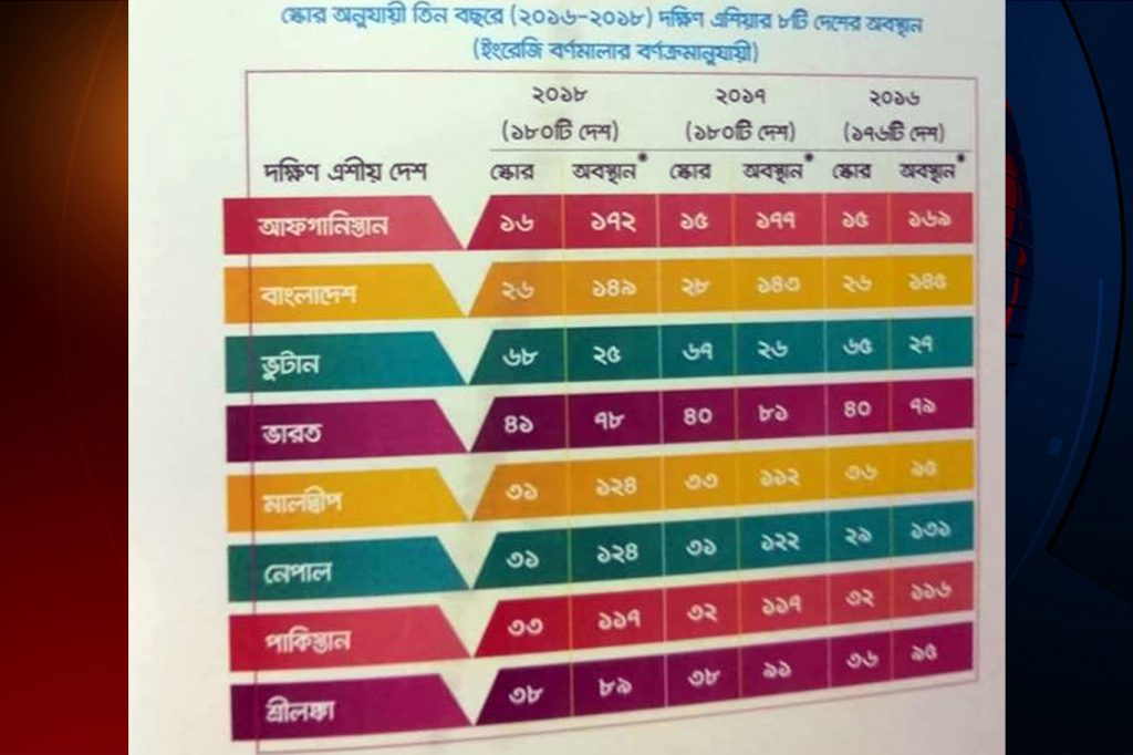 প্রতিবেদনে দেখা যায় ১৮০টি দেশের মধ্যে বাংলাদেশ ১৪৯তম। দক্ষিণ এশিয়ায় ৮ দেশের মধ্যে সবচেয়ে দুর্নীতিগ্রস্ত দেশ আফগানিস্তান, এরপরের অবস্থানই বাংলাদেশের। এ অঞ্চলে সবচেয়ে কম দুর্নীতিগ্রস্ত দেশ ভুটান।