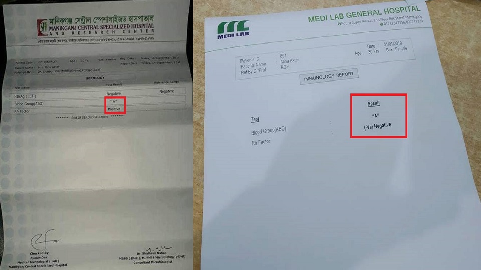 মানিকগঞ্জের সাটুরিয়া উপজেলার দরগ্রাম ইউনিয়নের পুনাইল গ্রামের সিংগাপুর প্রবাসী সফিকুর ইসলামের স্ত্রী মিনু আক্তার। ৪ মাস আগে মানিকগঞ্জ বাসস্ট্যান্ড এলাকায় পৌর সুপার মার্কেটে অবস্থিত সেন্ট্রাল স্পেশালাইজড হাসপাতালে রক্তের গ্রুপ পরীক্ষা করান। তার রক্তের গ্রুপ পরীক্ষা করে ‘এ’ পজিটিভ রিপোর্ট দেয়া হয়। রিপোর্টে ল্যাব টেকনোলজিষ্ট সুমন দাস ও ডাঃ সামছুন্নাহারের স্বাক্ষর রয়েছে।