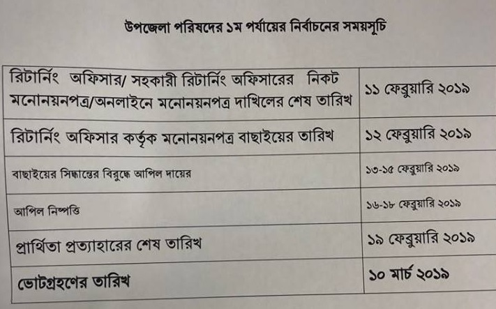 প্রথম ধাপের ভোটের জন্য প্রার্থীরা মনোনয়ন জমা দিতে পারবেন ১১ ফেব্রুয়ারি পর্যন্ত। এরপর যাচাইবাছাই হবে ১২ ফেব্রুয়ারি। প্রার্থিতা প্রত্যাহারের শেষ দিন ১৯ ফেব্রুয়ারি।