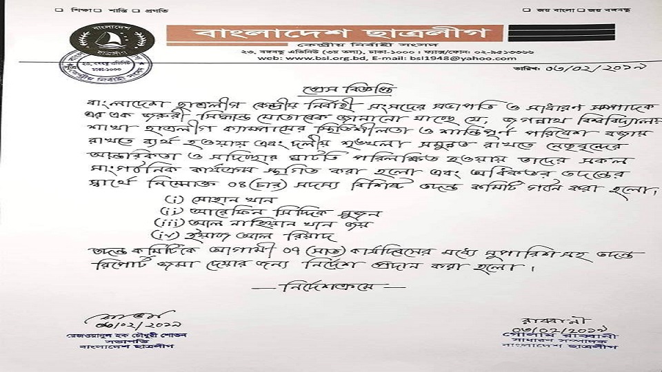 বিজ্ঞপ্তিতে বলা হয়, জগন্নাথ বিশ্ববিদ্যালয় শাখা ছাত্রলীগ ক্যাম্পাসের স্থিতিশীলতা ও শান্তিপূর্ণ পরিবেশ বজায় রাখতে ব্যর্থ হওয়ায় এবং দলীয় শৃঙ্খলা সমুন্নত রাখতে নেতৃবৃন্দের আন্তরিকতা ও সদিচ্ছার ঘাটতি পরিলক্ষিত হওয়ায় তাদের সকল সাংগঠনিক কার্যক্রম স্থগিত করা হলো এবং অধিকতর তদন্তের স্বার্থে চার সদস্য বিশিষ্ট তদন্ত কমিটি গঠন করা হলো ।